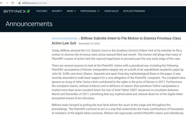 Bitfinex深知此案影响深远,一旦败诉,估计老本都要赔光,而且开这个口,后面不知还有多少诉讼会接踵而来。Bitfinex全力在第一步上加以阻挡。11月15日Biftinex发公告:已经向法庭提出动议,要求法庭不要受理原告的集体诉讼。当然,Bitfinex提出的理由一如既往的苍白,主要就是说两位教授的研究不对,原告指控不实。。。全文2页字,没有任何实质证据,缺乏说服力。相比之下96页的血泪申诉和196页的教授研究报告,控方显然做足了功课,收集大量证据,事实和论据非常充分。双方气势上的强弱,一目了然。