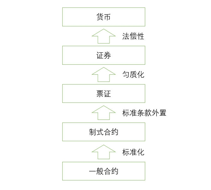 重点在于,我们构造出一个层层递进的概念构造,即合约是最基础、最一般的资产表达,标准化制式合约是特殊的合约,票证是特殊的标准化制式合约,证券是特殊的票证,货币则是特殊的证券。五者的关系表达为下图: