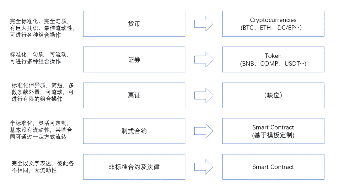 在上面的讨论中,我们指出,资产是一组权利的集合体,它很抽象,但可以符号化和物化表达。我们还指出,货币、证券、地契等标准化票证都是资产的表达形式。但如果追根溯本,我们会认识到,合约才是资产的基本表达形式,票证只不过是标准化程度较高的制式合约而已。
