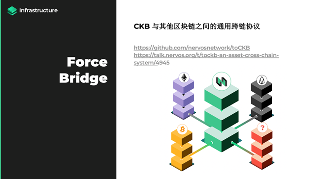 首先是一个通用的跨链协议,在 Nervos Network 中,我们把它叫做 Force Brideg。所谓的通用是说,让 Nervos Network 的 CKB 和其他任何一条链打通的跨链协议,比如比特币区块链、以太坊区块链等。可以查看 Force Brideg 的相关代码: