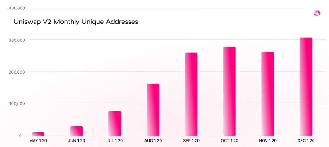 光荣与梦想:Uniswap的2020回顾和2021展望 刘教链 • 2021年1月4日 12:23 • DeFi, 亚洲, 深度, 环球 (图片来源于uniswap官方博客) 1 2020年最后一天,12月31号,DEX龙头Uniswap(代币符号:UNI)发表了官方博客,题为《Uniswap的年度总结:2020》(原文链接:https://uniswap.org/blog/year-in-review/ )。当天UNI大涨20%+,之后几日更是芝麻开花节节高,站上了5刀多的“高位”。 且让我们来看看官方放出来什么利好消息吧。 2 先是谈2020年5月份发布的V2版本的功能创新: 我们普通用户最熟知和常用的买卖币功能其实叫做“闪兑”或者“闪电交换”(flash swap),5月上线以来累计交易量48亿刀,捕获了1440万刀的手续费收入分给了LP(流动性提供者)们。 自家研制的报价预言机TWAP,全称叫做“时间加权平均价格”预言机(time weighted average price oracle),获得了超过50个第三方的集成(包括诸如compound, augur v2, ESD稳定币,等)。是目前市面上仅次于ChainLink(代币符号:LINK)的应用第二广泛的预言机!哈哈,想不到吧。很多人想布局预言机赛道,看LINK太贵了,于是就去买其他的chainlink对标产品,却不知道uniswap其实有个链上对外输出报价的预言机能力。 3 然后是数说uniswap。交易量和流动性的图我就不放了,这两个图是关注uniswap的朋友最常看的图了,在info.uniswap.org上几乎是日刷甚至小时刷 :) 2020年交易量580亿刀,比2019年的3.9亿刀增长了150倍!现在的uniswap是全球排名第5大的交易所(和CEX一起排名,仅计算crypto spot trading),按交易量计算的市占率在所有DEX中占54%以上。 年底20亿刀的流动性,比年初1200万刀增长了170倍。超过6.8万个独立地址为超过2.7万个交易对提供了流动性。出现了超过4400个非ETH交易对(比如HKMT-USDT),并在前25个流动性最好的交易对里占据了7个。 4 月活独立地址数这张图得引用一下,毕竟是官方出品。 (图:Uniswap 2020年月活数据) 年底超过29万个月活地址。在以太坊所有交易中,uniswap贡献了25%的交易数量。2020年交易的中位数价值只有634刀。可见,uniswap所满足的,是一个长尾代币市场,交易数量大,但是单价小。这一点使其和传统的中心化交易所形成了显著的差异化。 5 第三方集成,这看出来uniswap生态的格局。其实是一个很重要的隐形指标。 (图:Uniswap的第三方集成数量) 超过200个各种第三方应用集成了uniswap协议。官方特意强调了几个比较重量级的:MakerDAO支持uniswap LP token作为抵押借贷资产。Uniswap闪电贷被用于执行Aave v2抵押交换。Fireblock把uniswap集成到了他们的DeFi API里。 大家还记得UNI社区12月刚通过关于UGP的提案吧?预期也是增强uniswap的生态布局。 6 到了投资者最关心的UNI代币的部分了。 目前有超过11万地址持有UNI,使得它成为以太坊上最广泛被持有的代币之一。 博客还特别提了一下空投,说给历史用户总共发出去1.5亿枚UNI,现在价值约6.3亿刀,这是给大家提前过圣诞节了(官方原话)。简单算一下,官方这是按4.2刀/UNI的单价计算的总价值。 另外从9/16到11/16期间第一期流动性挖矿又分发出去2000万UNI给了LP们。 7 治理方面,社区财政(community treasury)当前持有4700万枚UNI。第一个成功执行的提案是12/17关于UGP (Uniswap Grants Program v0.1)的。 8 忙里偷闲,uniswap团队还推出了两个足以形成行业规范和标准的简单小产品: 一个是tokenlist.org。2020年8月份由uniswap发明并推出的这个开放代币列表标准,俨然已经成为行业规范,被一众数字货币产品所采用,比如coingecko, cmc, messari, set protocol, kelero, wrapped.com。其实开放代币标准才是最具杀伤力的武器。CEX靠什么牟利?所谓上币费,其实也就是“加入列表”的费用,就要收取几千万。uniswap是开放协议,列表也是开放标准。这就叫做“颠覆式创新”。 另一个则是sybil,一个DAO治理工具,可以帮助投票者查看UNI代币委托情况,以及投票情况,还有可以把自己的推特账号(身份)和投票地址绑定,以便更好取得社区信任。为了搞好社区治理,uniswap这是花了大力气。 从这两个辅助项目可以看出uniswap团队的做事风格:磨刀不误砍柴功。在这个圈子、这个行业,能有这种精神做事的团队,真的不多。 9 回顾完了,该说说2021年的展望了。不过仍然秉持一贯态度,暂时保密。因此只是比较笼统的谈论了一下着重改进和提升的方面: 首先当然就是AMM自动做市商。官方说在v3中对AMM的改进取得了相当大的(considerable)进展。在引入“超级执行”(superior execution)后,交易者和LP的AMM体验都会得到大幅改进(drastically improve),包括资金效率、灵活性。具体什么样子的改进,保密 :) 其次是扩容问题了。这个也是社区猜测最多的,因为毕竟官方已经放出来一个基于二层扩容技术OR (optimisitic roll-up)的测试产品unipig。更低的交易延迟,更快的结算,更便宜的交易费用,这是官方承诺的。具体情况,还得等正式版上线。 最后大篇幅说了一把治理。提了UGP。特别是,官方可能也发现过去俩月社区治理有些太松散,议事、决策和落地效率不高。于是官方说核心团队的人也会运用个人能力更直接的“参政议政”,参与到治理当中去。当然,官方承诺团队成员参与社区治理不会动用超过其个人持有10%以上的UNI。治理仍然由社区来主导。 10 以上。总结完毕。最后附上前两天在知识星球「加密投资X财务自由」VIP会员群里讨论关于建仓UNI的话题的一些问题和观点,可能对于解答关注UNI投资的一些读者的疑惑有所帮助。 问:uni 你认为今年能翻十倍,理由呢? 答:下