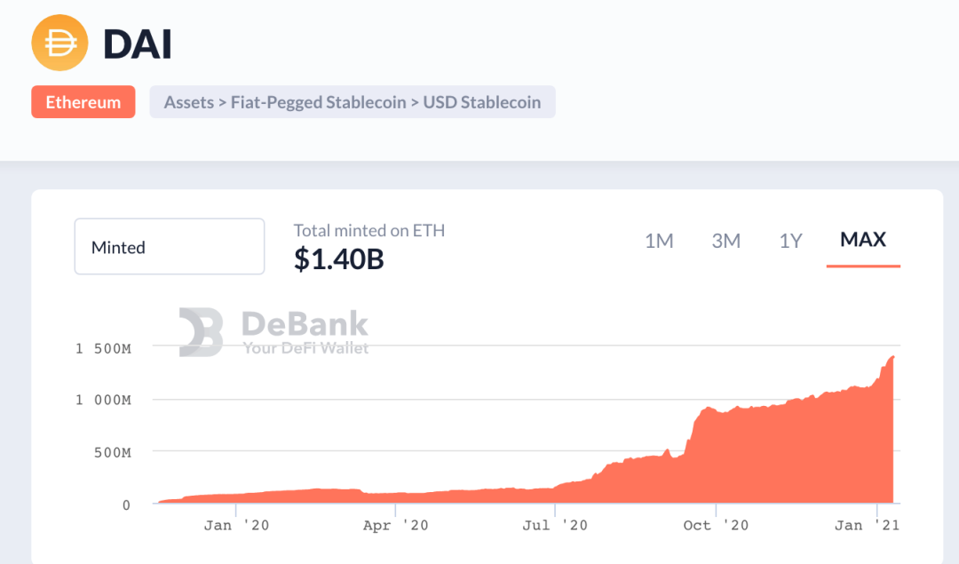2020年的DeFi热潮让去中心化稳定币Dai的发行量超过了14亿美金,相较年初发行量7000万的发行量,增长了超过20倍(Debank数据)。由此说去中心化的稳定币是DeFi资产的基石毫不为过。