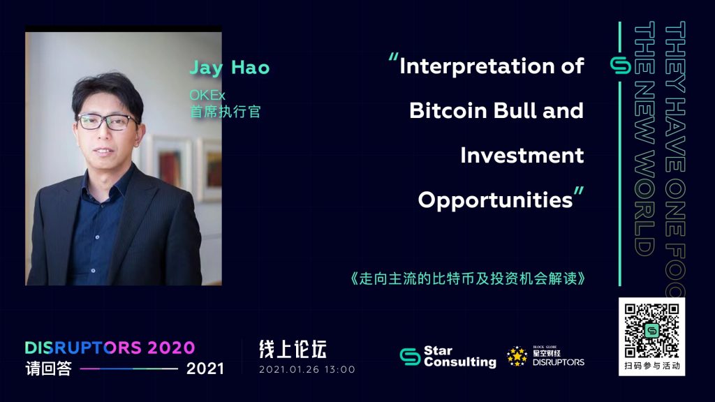 1月26日,由星空咨询(Star Consulting)和星空财经主办,币世界、Fintech4Good、HerTech联合主办的「Disruptors 2020:请回答2021」线上论坛正式举行。OKEx首席执行官Jay Hao在本次论坛上分享了其对本轮比特币牛市的看法和预测。他认为,本轮比特币牛市由机构投资者推动,这一点已经在业内达成了共识。OKEx的研究团队最早从去年10月左右观察到有传统投机机构入场的迹象,成为在行业内最早发出“传统投资者正在入场”的机构之一。