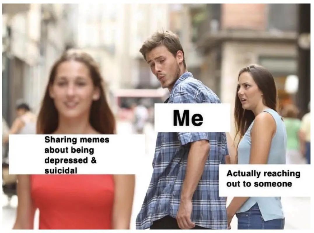互联网meme是年轻人表达情感的一种方式,也是将抑郁和悲观情绪转化为创造性发泄的一种方式。我们应该注意到,与网络陌生人建立共同点和表达自我的一种常见方式是通过关于抑郁、自杀和孤独的meme。虽然这些只是一个个轻松的玩笑,但它们也是千禧一代和Z世代所处环境的产物。