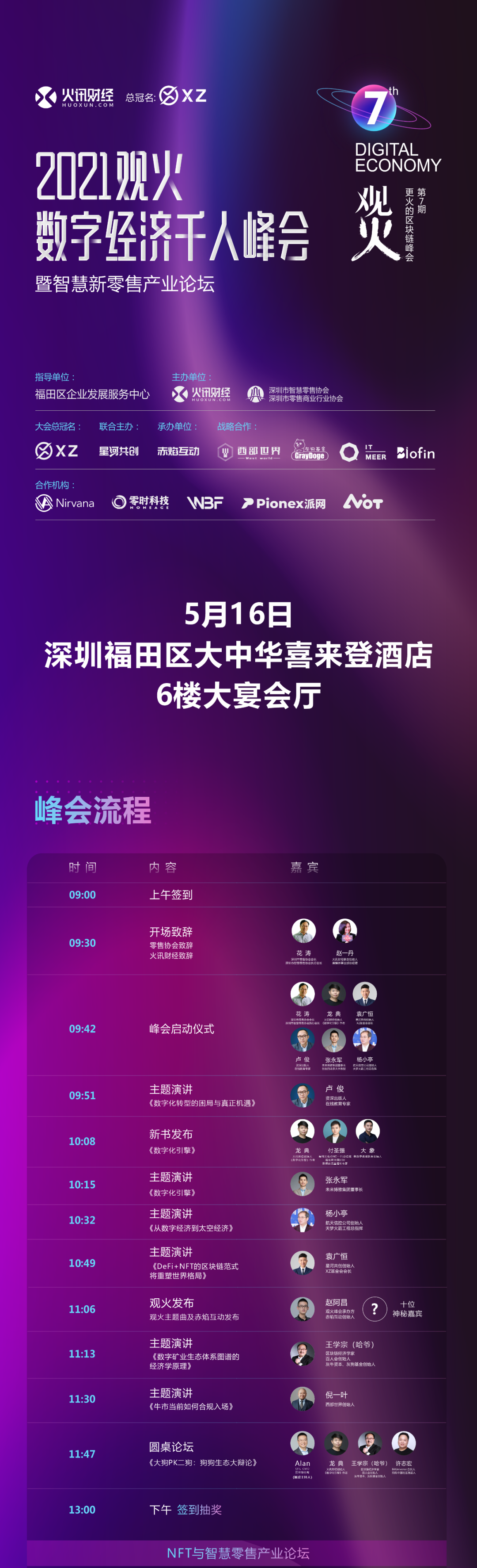 本次大会由福田区企业发展服务中心作为指导单位,由火讯财经、深圳市智慧零售协会、深圳市零售商业行业协会主办,XZ智能药柜作为大会总冠名,由星河共创,赤焰互动承办,西部世界、灰狗基金、Qitmeer作为战略合作单位。