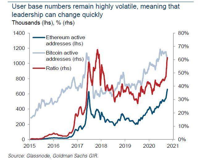 高盛认为,考虑到真实用途、用户基数、技术迭代速度等多方因素,以太坊很有可能取代比特币成为主流的加密货币。