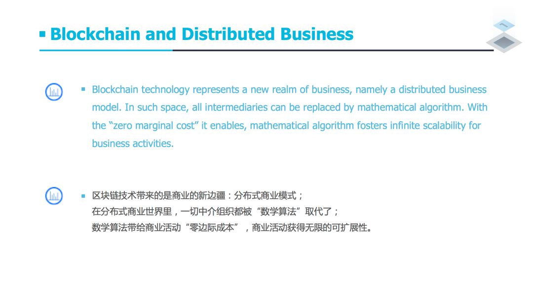 我已经讲过了,区块链不是去颠覆、不是取代线下或者物理空间里面的商业。区块链带来了一个新的商业的边界,我们把它叫做「分布式商业」。我们现在所熟悉的商业中介,在区块链时代都会被取代,人们变成点对点、去中心化重组的商业业态。我把它叫做「分布式商业模式」。