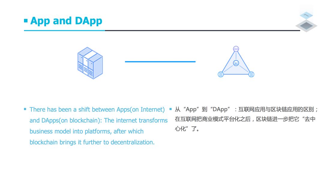 在互联网时代,我们把应用叫做 App。在区块链时代,我们把应用叫 DApp。App 和 DApp,充分地说明了互联网和区块链之间的区别,非常重要的一个区别。