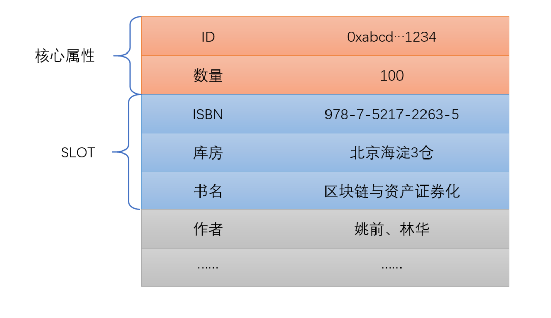 SLOT 可以发挥什么作用呢?一个 SLOT 就是 vNFT 中的一个属性子集。假设一个 SLOT 圈定了(书号,仓库编号,书名)三个属性,其意义就是说,只要两个 vNFT 在这三个属性上完全一样,那就可以被归入一类。