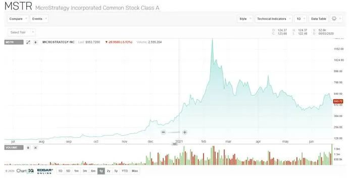 今年2月9日,由于微策略 World 2021活动相当火爆,微策略股价涨至历史最高点,收盘报1272.94美元。几天后,投资情绪回落,但仍维持在900美元上方。