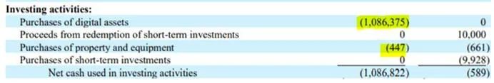 如果看财报会发现,到2021年Q1,微策略总资产24.43亿美元,其中19.46亿美元都来自数字资产。在现金流量表上,今年前三个月公司花出10.86亿美元,其中只有44.7万美元用来采购固定资产等“真实资产”,也就是说花的钱里99.96%都用来买比特币了。