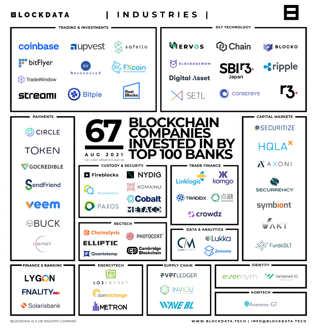 总部位于伦敦的渣打银行以3.8亿美元的投资位居榜首,而总部位于伦敦的竞争对手巴克莱银行(Barclays)在数量方面是对区块链公司的投资最活跃的投资者。