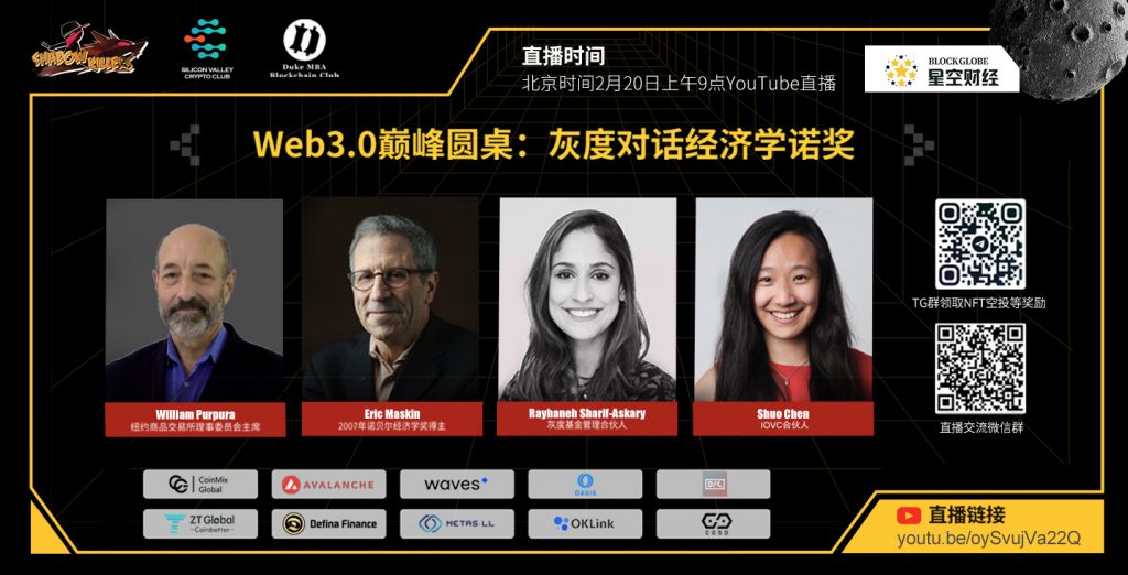 2022年2月20日,Shadow Killers联合Silicon Valley Crypto Club(硅谷加密俱乐部)和Duke MBA Blockchain Club(杜克大学MBA区块链俱乐部)共同举办主题为《Web3.0巅峰圆桌:灰度对话经济学诺奖》线上直播活动。