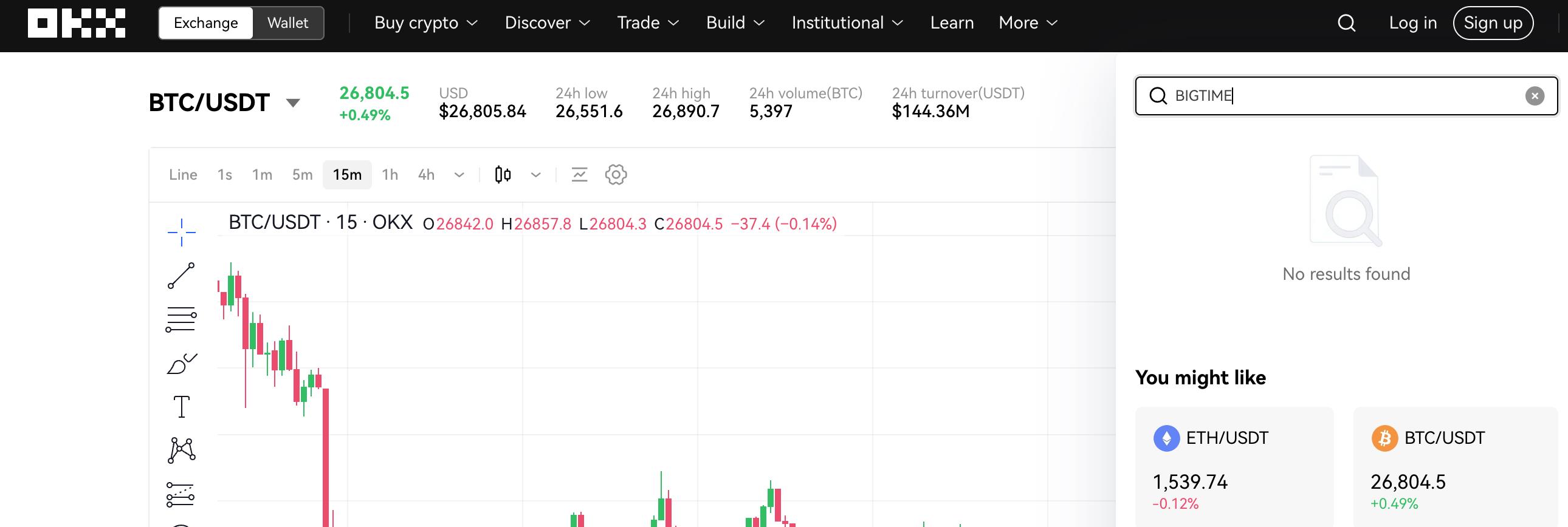 当前代币现货流动性最大的OKX,如果在亚洲区直接搜索BIGTIME,你会发现根本就搜不出结果,现货交易入口被关闭。