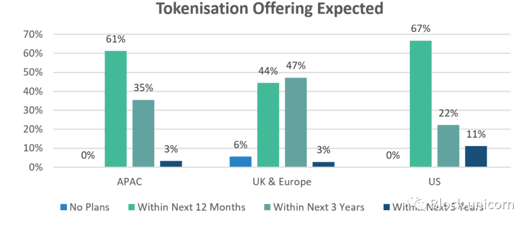 进一步分析数据,我们发现总体上,总部位于美国和亚洲的公司对于在短时间内向市场推出代币化产品持最乐观态度,分别有67%和61%的调查参与者表示认为在一年内是可能的。就亚洲地区而言,近86%的公司表示在三年内有望实现。