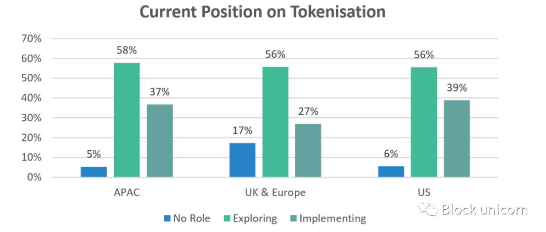 当被问及他们当前对代币化及其可能对日常活动产生的影响的态度时,只有少数受访者(约10%)表示他们目前在业务中看不到这项技术的角色。或许更令人印象深刻的是,超过50%的受访者声称正在探索其在特定领域的应用。在实际推行有形的代币化项目方面,美国和亚洲在区域层面再次走在了前列。在这两个地理位置上,近40%的公司表示他们正在积极在业务中推行这些项目。