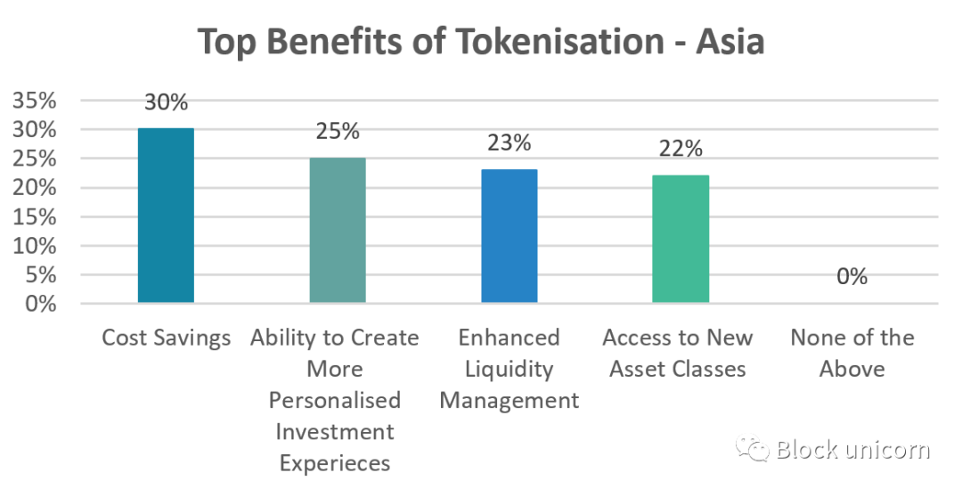 尽管亚洲的受访者确实认为降低成本是代币化的最大好处,但与其地区同行相比,这些参与者更有可能表示,开发更定制的投资解决方案是一个关键优势,特别是为了更好地为超高净值(UHNW)客户提供服务。该地区约有25%的公司表示这是一个重要的考虑因素,而在全球范围内为23%。