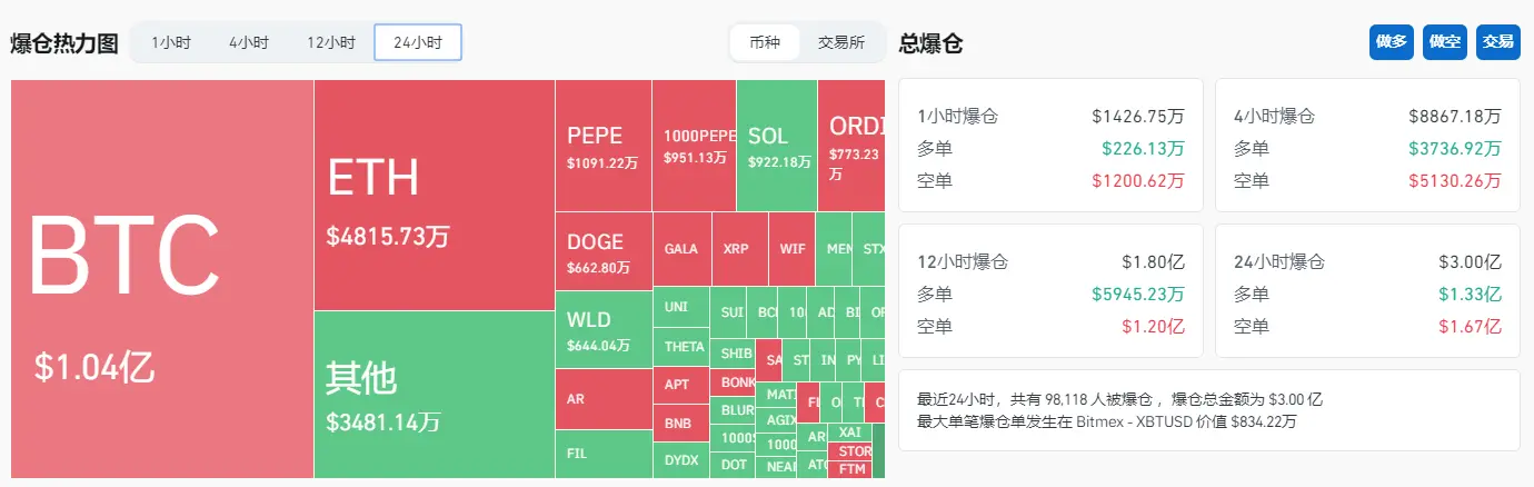 衍生品交易方面,Coinglass 数据显示,过去 24 小时全网爆仓 3 亿美元,其中空单爆仓 1.67 亿美元,多单爆仓 1.33 亿美元;BTC 爆仓 1.04 亿美元,ETH 爆仓 4815 万美元。