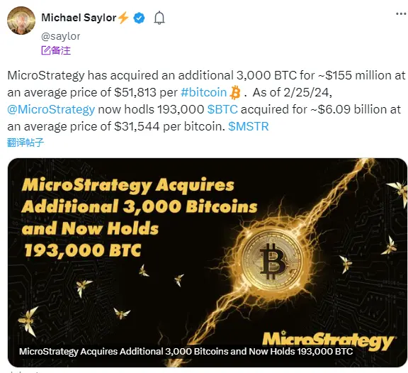 2 月 13 日,MicroStrategy 首席执行官 Michael Saylor 接受 CNBC 采访时表示,比特币现货 ETF 的购买需求远大于矿企的供应量,将购入更多比特币。