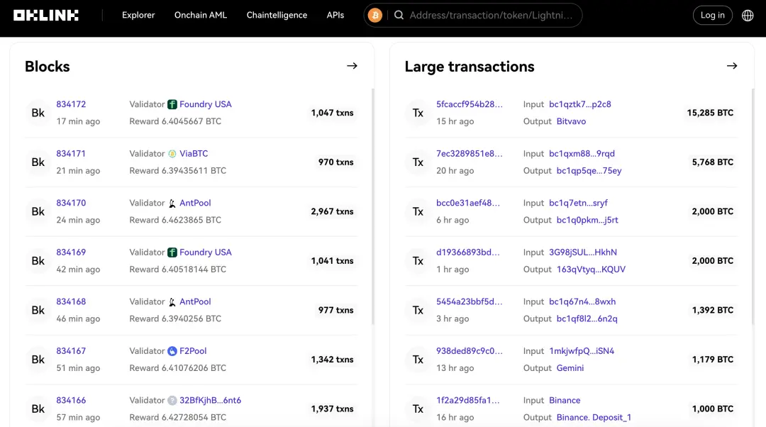 更细致和具体的资产移动情况也可去区块链浏览器上查看实时动态以及大额转账。从OKLink数据可以看出,BTC在近几日的大额转账的出现频率也在增多。