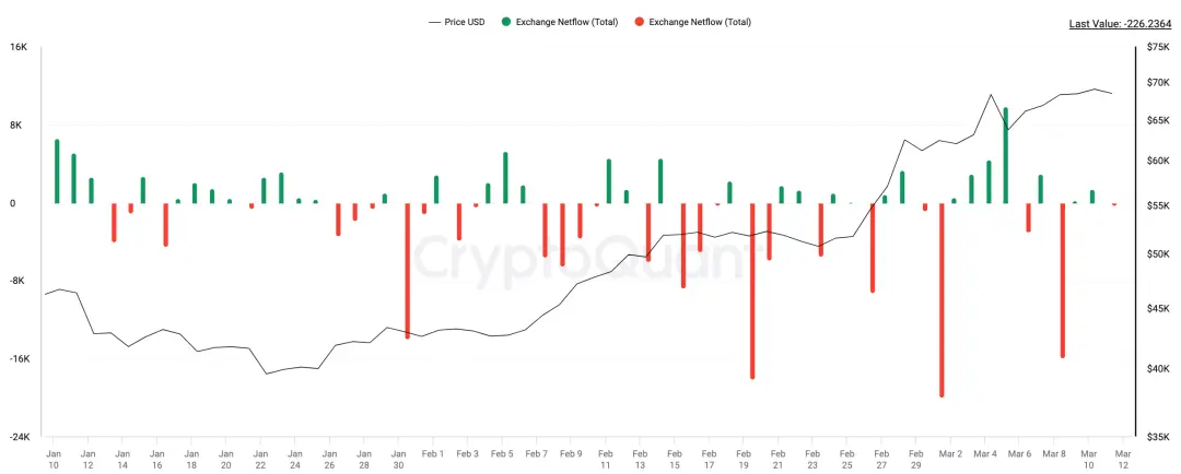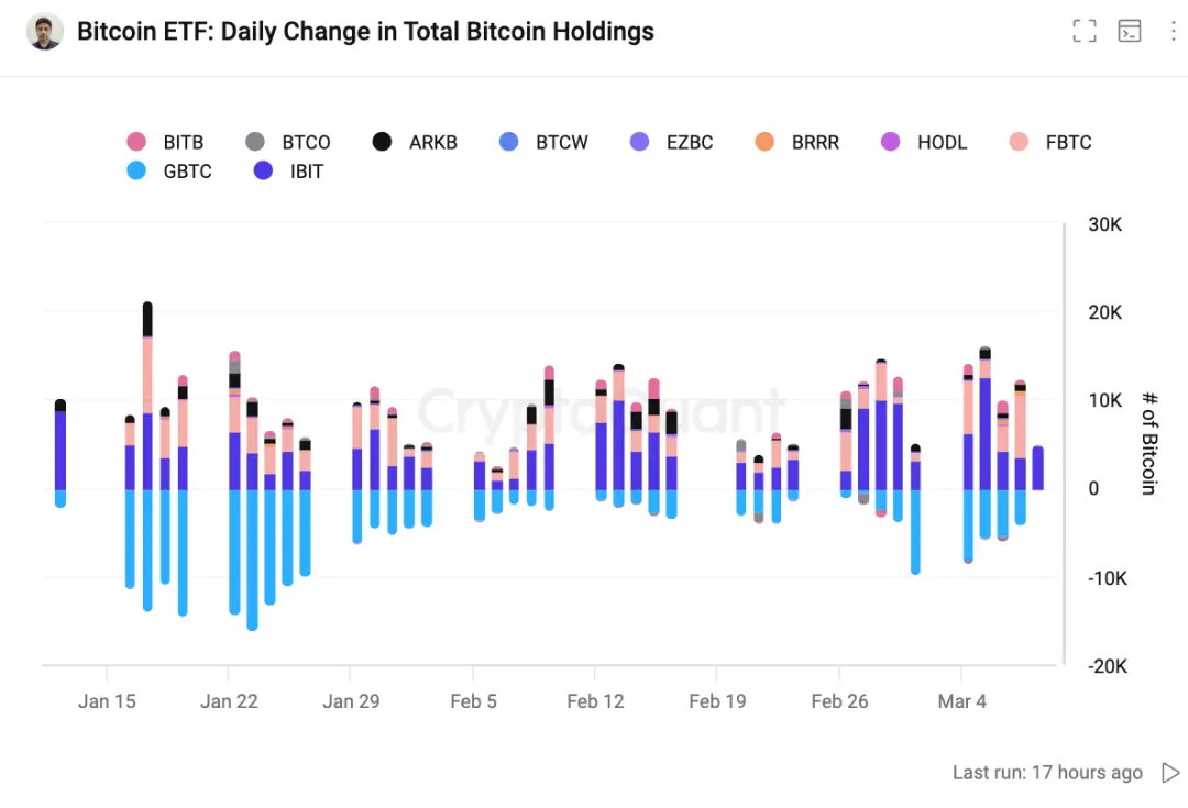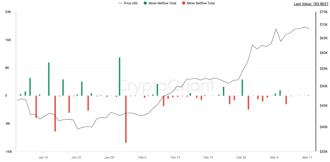 在需求端,尽管市场上一直在讨论灰度不断抛售BTC的情况,由于各个数据来源的统计会有偏差以及各机构更新现货ETF的时间有所偏差,这里根据CryptoQuant以及Farside数据综合测算,通过BTC现货ETF这一渠道进入市场的资金规模累计已达到95.94亿美元,与BTC现货ETF被允许交易时相比,截至当地收盘时间3月8日净流入总量约为176,396枚BTC。仅BTC现货ETF一个通道,就让BTC在市场上达到了供不应求的状态,缺口目前来看达到了9.5万多枚BTC。然而,真正的BTC供给源头是矿工。尽管存在其他渠道如交易所的BTC流出,但这并非可持续的供给来源。