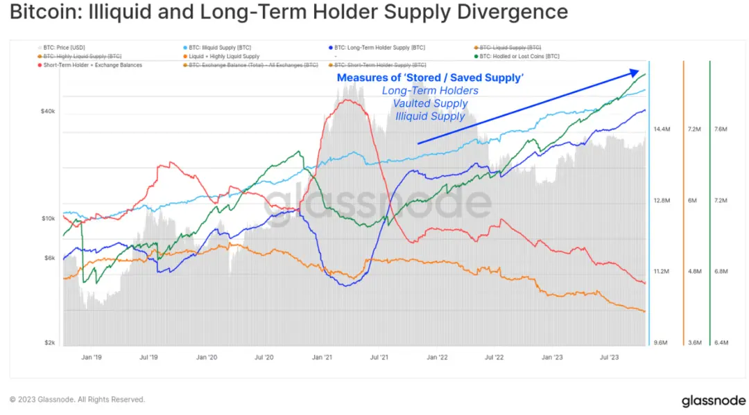 长期持有者转到链上无论从地址数还是从资金量两方来看均呈现一个扩大趋势。根据Glassnode近期报告称,用于长期投资的BTC锁定率已经超过了新增供应量的200%以上。这意味着,尽管新的BTC仍在不断被开采出来,但更多的BTC被投资者持有,而不是出售或交易。