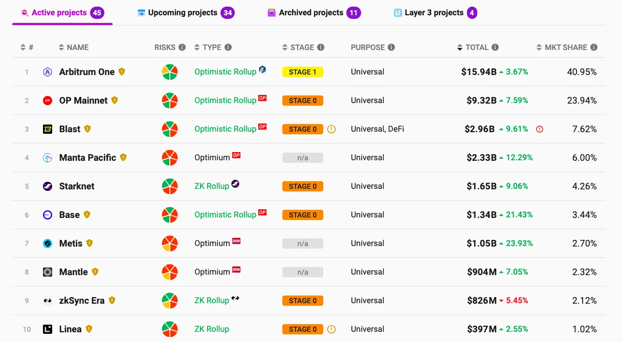 首先,Dencun 升级自然会直接利好整个 Layer 2 板块。L2 BEAT 数据显示,当前处于运行状态的 Layer 2 数量高达 45 条,待上线主网的 Layer 2 数量亦有 34 条,这其中包含了我们已相当熟悉的 Optimism(OP)、Arbitrum(ARB)、Starknet(STRK)、Metis(METIS)、Manta Pacific(MANTA)等已发币项目,以及 zkSync、Blast、Linea、Scroll 等未发币项目。
