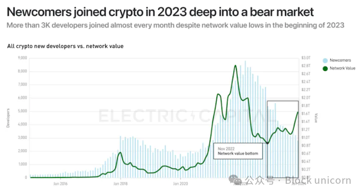 随着加密货币的价值观越来越与基础设施、工具和中间件的升级产生共鸣,我们看到了数据支撑加密货币的至关重要的领先指标:开发者流量。我们在支持加密货币至关重要的领先指标的数据中看到了一个充满希望的故事:开发者流量。