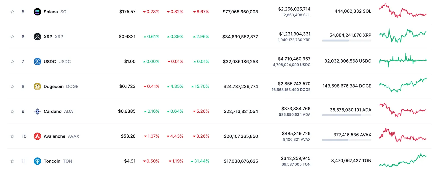 本文截稿时,Toncoin 在 CoinMarketCap 上排名为第十一位,市值 171 亿美元,而第五名的 Solana 市值为 783 亿美元,五倍的距离。同样对比交易量,SOL 日交易量达到 22.1 亿美元,TON 则为 3.33 亿美元。另外,加密研究员日月小楚对 TON 的链上筹码进行了分析,表示 TON 总量 51 亿枚,流通 38 亿枚,项目方手上有约 9.6 亿枚,而早期低成本矿工则拥有超过 10 亿枚。而且早期矿工有一部分是基金会。这种分布模式突显了开发团队和相关利益方保留了相当一部分代币,可能用于未来的开发、市场推广和生态系统奖励等方面。但也表明 TON 生态系统在初期依赖于这些关键支持者的事实。