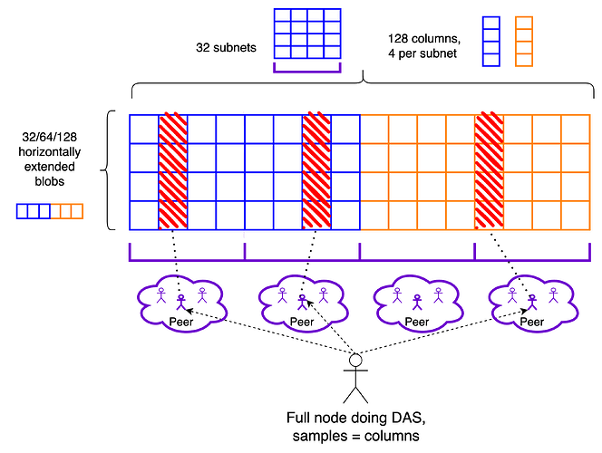 如果每个节点需要下载并存储所有数据的 1/8 ,那么理论上 PeerDAS 允许我们将 blobs 的规模扩大 8 倍(实际上是 4 倍,因为我们因擦除编码的冗余而损失了 2 倍)。PeerDAS 可以随时间推出:我们可以有一个阶段,在此阶段专业的质押者继续下载完整的 blobs,而单个质押者只下载 1/8 的数据。