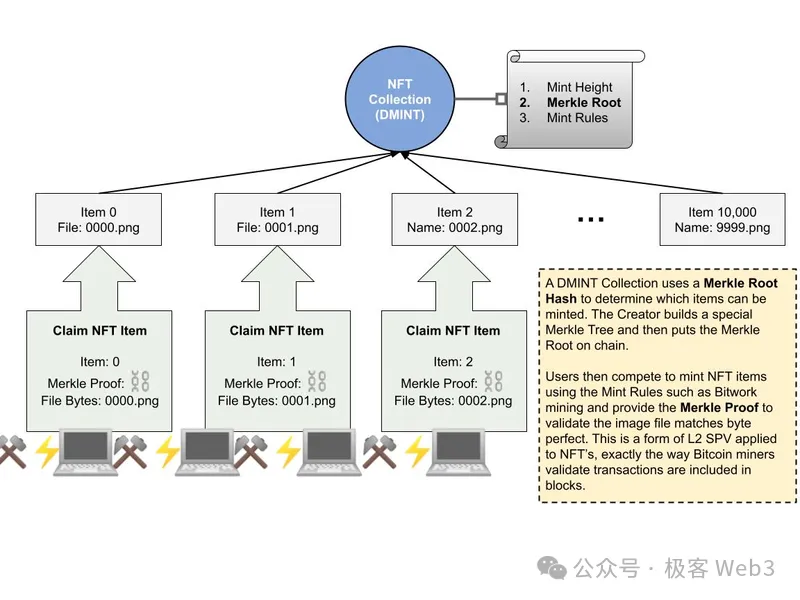 对NFT项目方而言,工作重点可以集中在NFT发行前的准备工作,需要归集所有NFT的数据、配置Dmint数据等。同时,遵循Dmint协议的NFT发行方,会把全部的NFT数据汇总构建成一棵Merkle Tree,这棵树的Merkle root会发布在链上,完整的NFT元数据则都保存在链下。