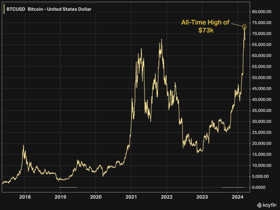 与此同时,比特币价格也因数百亿美元传统资金的涌入而创下 73000 美元的历史新高——这是继 2017 年 19450 美元、2021 年 4 月 63400 美元和 2021 年 11 月 67700 美元之后,比特币所到达的第四个历史新高。