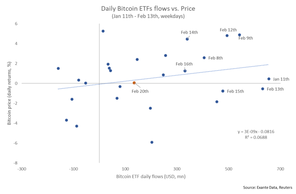 下图显示了比特币 ETF 资金流入和比特币价格之间的相关性。在推出后的十天左右(1 月 11 日至 23 日),比特币价格下跌 15%,在一定程度上打击了资金流入的积极性。但在接下来三周内,比特币价格上涨 30% 左右,并带动了大量资金涌入加密市场。