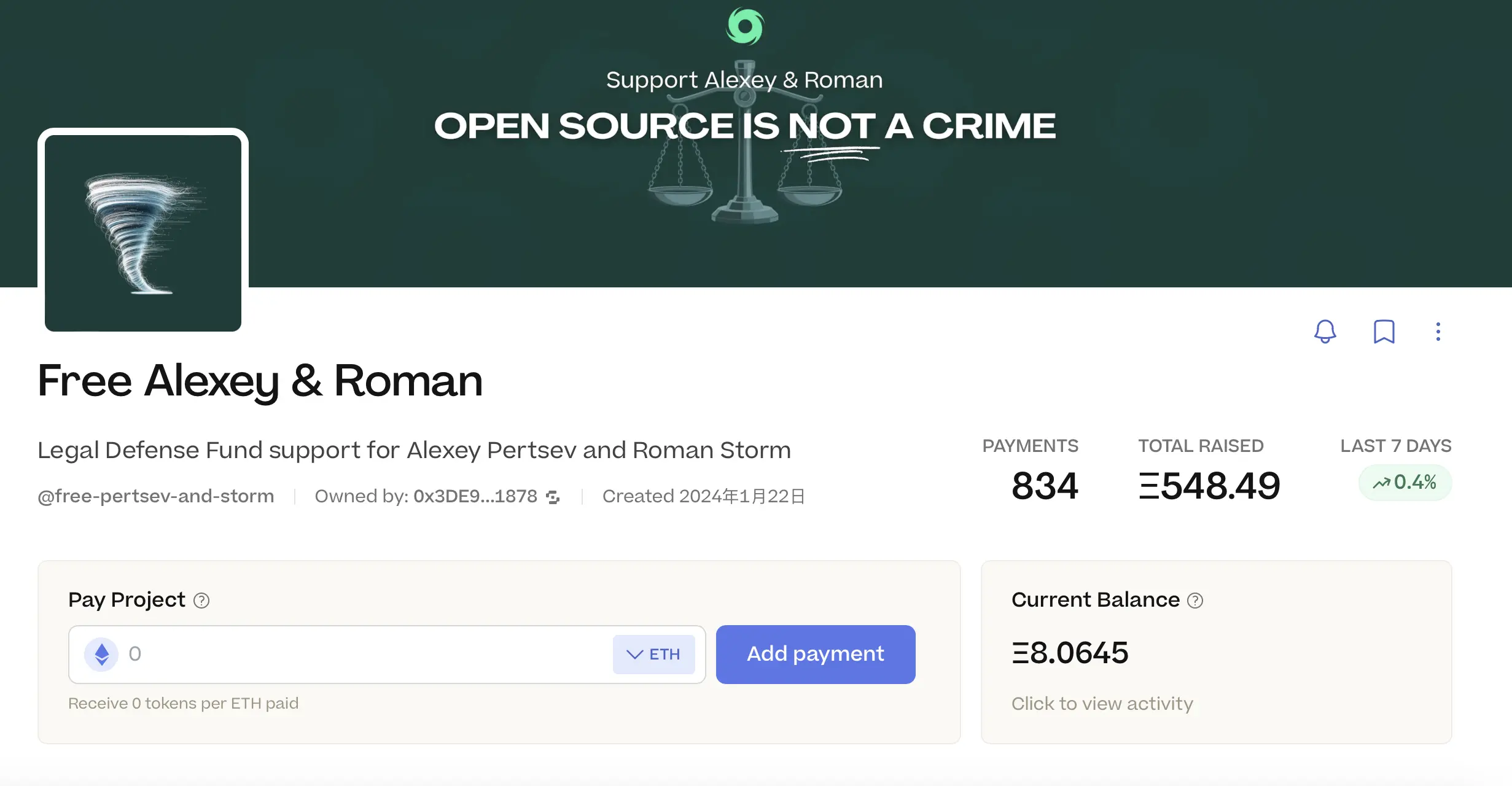 此外,有加密社区成员于今年1月22日在众筹平台 Juicebox发起名为“Free Alexey & Roman”的捐赠活动,作为帮助 Tornado Cash 联创 Roman Storm 及开发者 Alexey Pertsev 免于法律惩戒的法律辩护基金。截至发稿前,该基金共收到834笔捐款,总金额达548.49ETH,约合160万美元。以太坊联合创始人 Vitalik、加密交易平台 Kraken 联合创始人 Jesse Powell 等都为基金提供了捐赠。