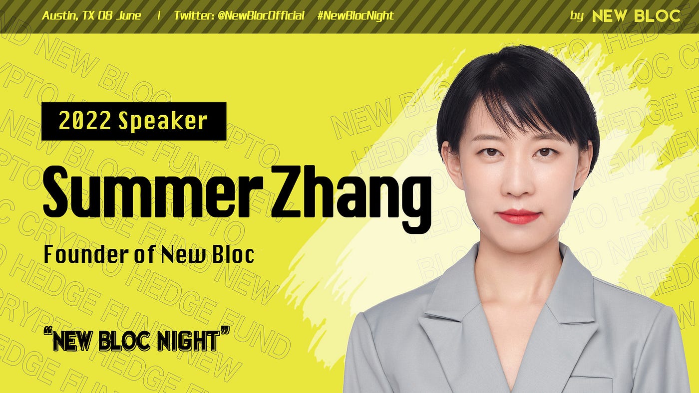 此次活动由New Bloc 创始人&CEO Summer女士进行开场演讲,Summer是New Bloc创始人,中国科学院和哥本哈根商学院硕士,连续创业者。New Bloc被评为亚洲十大加密资产对冲基金之一,产品累计净值多次获得评级机构第一。Summer 于 2014 年开始参与BTC挖矿,是加密金融的信徒和布道者。Summer也是进化时代的创始人,带领进化时代获得包括腾讯VP在内的数千万投资,服务超过600万女性客户。Summer曾就职于英国投资银行Vermilion Partners和清华大学。