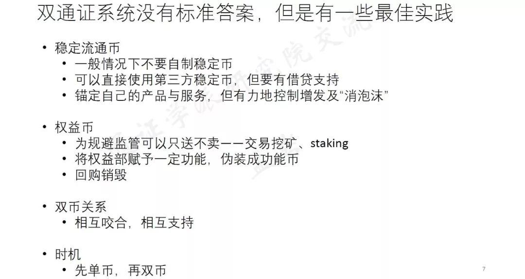 最后从时机上来讲,很多情况下,也许不应该一上来就做双币。可以先做一段时间的单币,很显然它应该是整个系统当中、日后要充当权益通证的,是一个波动币。