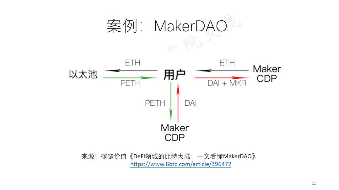 那么关于双层通证,我还建议大家研究的一个经典案例是 MakerDAO。大家研究双层通证的时候一定要研究一下这个例子,它会给你们带来很多启发。只不过 MakerDAO 这个例子也比较复杂,我简练地讲解一下。