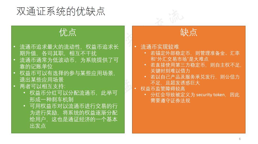 - 它的优点当然是很突出的,即流通通证可以尽可能地追求最大的流通性,而权益币就只专注于追求长期升值。这两个通证各司其职,互不干扰,这是最大的一个优点。