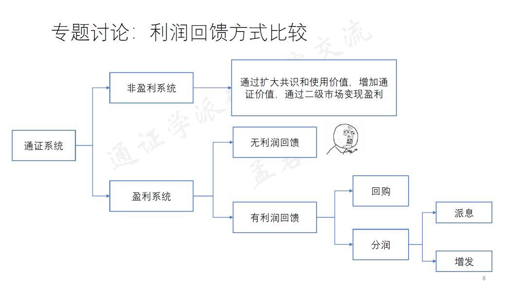 另外一个重要的问题:如果分润的话,究竟是派息好还是增发好?****显然是派息更好,派息的话才能够实现两个通证相互支持,相互咬合。但很多时候,这不由得你选,因为你可能没有足够多的息可以派出来。当然你可以说,把我系统当中的盈利部分的百分之多少拿来派。但如果这么做的话,很多时候你都会发现,盈利部分少得可怜,对用户也形成不了太好的激励。所以有的时候,尤其是一开始的时候,我们可能也要更多地采取增发的方式。而增发这个方式也是大家现在讨论比较多的。